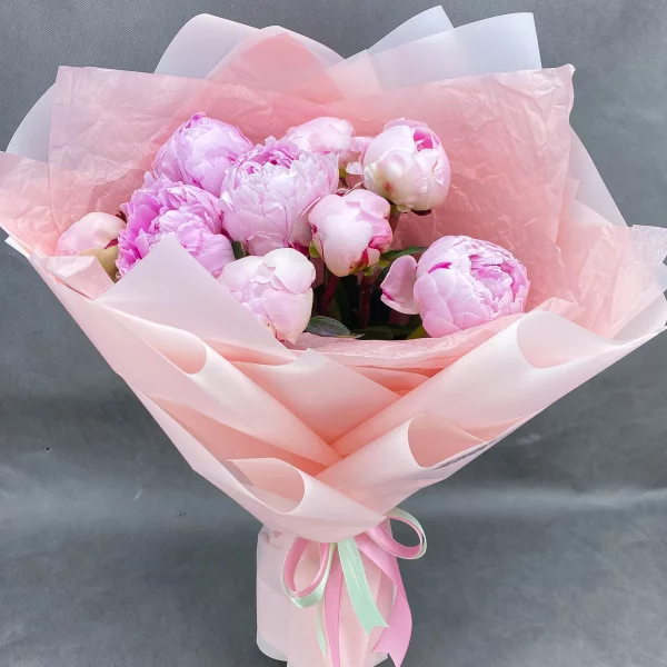11 пионов: пионы розовые- 11 шт., упаковка, лента.